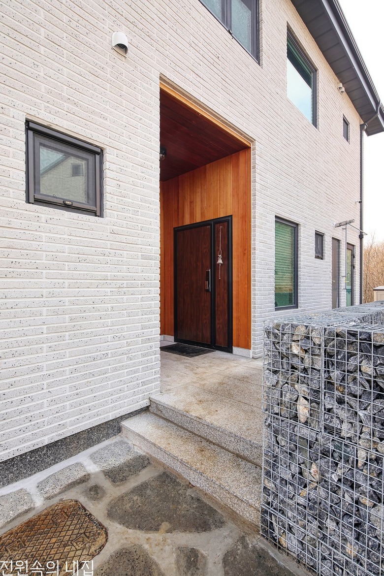 개비온 담장을 따라 아늑하게 조성한 출입구. 적삼목으로 마감해 따뜻한 느낌을 더했다. |