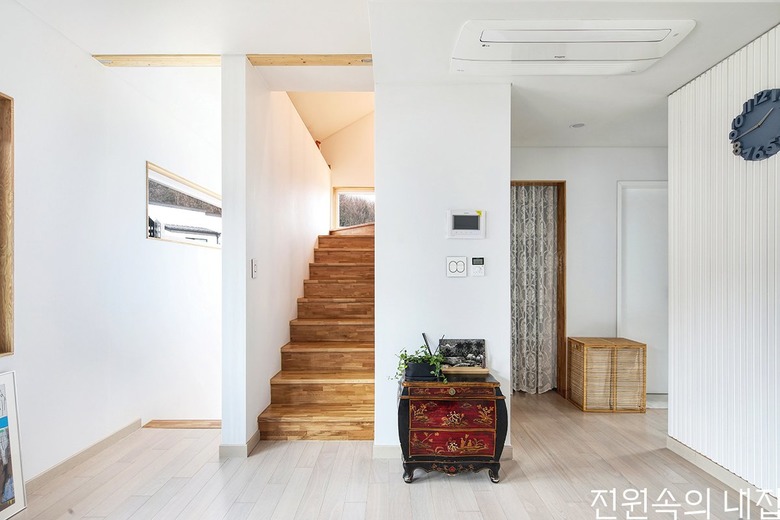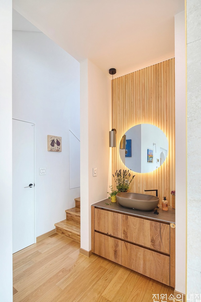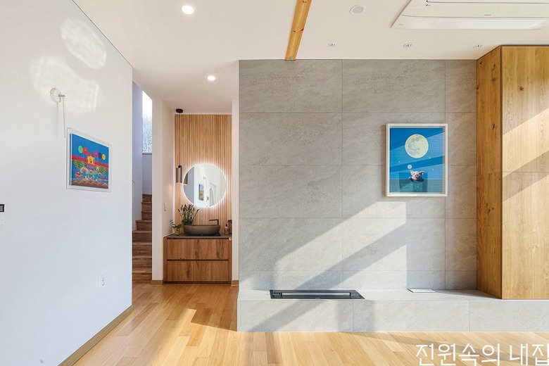 현관에서 들어와 계단실로 향하는 코지 공간에 세면대를 조성했다. |