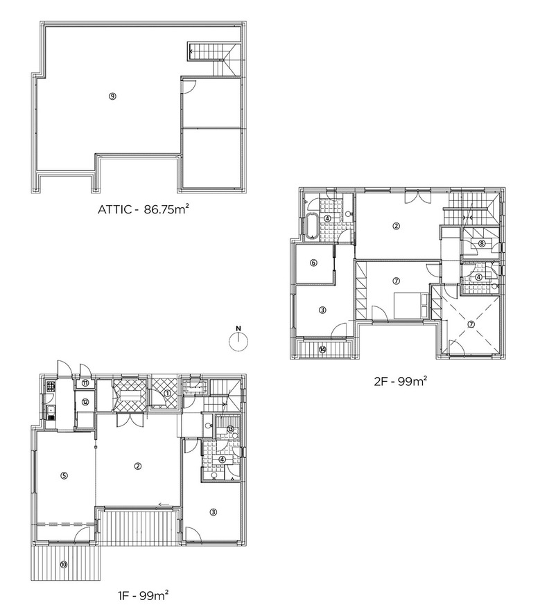 ① 현관 ② 거실 ③ 안방 ④ 화장실 ⑤ 주방 겸 다이닝룸 ⑥ 드레스룸 ⑦ 방 ⑧ 세탁실 ⑨ 다락 ⑩ 데크 ⑪ 보일러실 ⑫ 펜트리 ⑬ 사우나 ⑭ 베란다 |