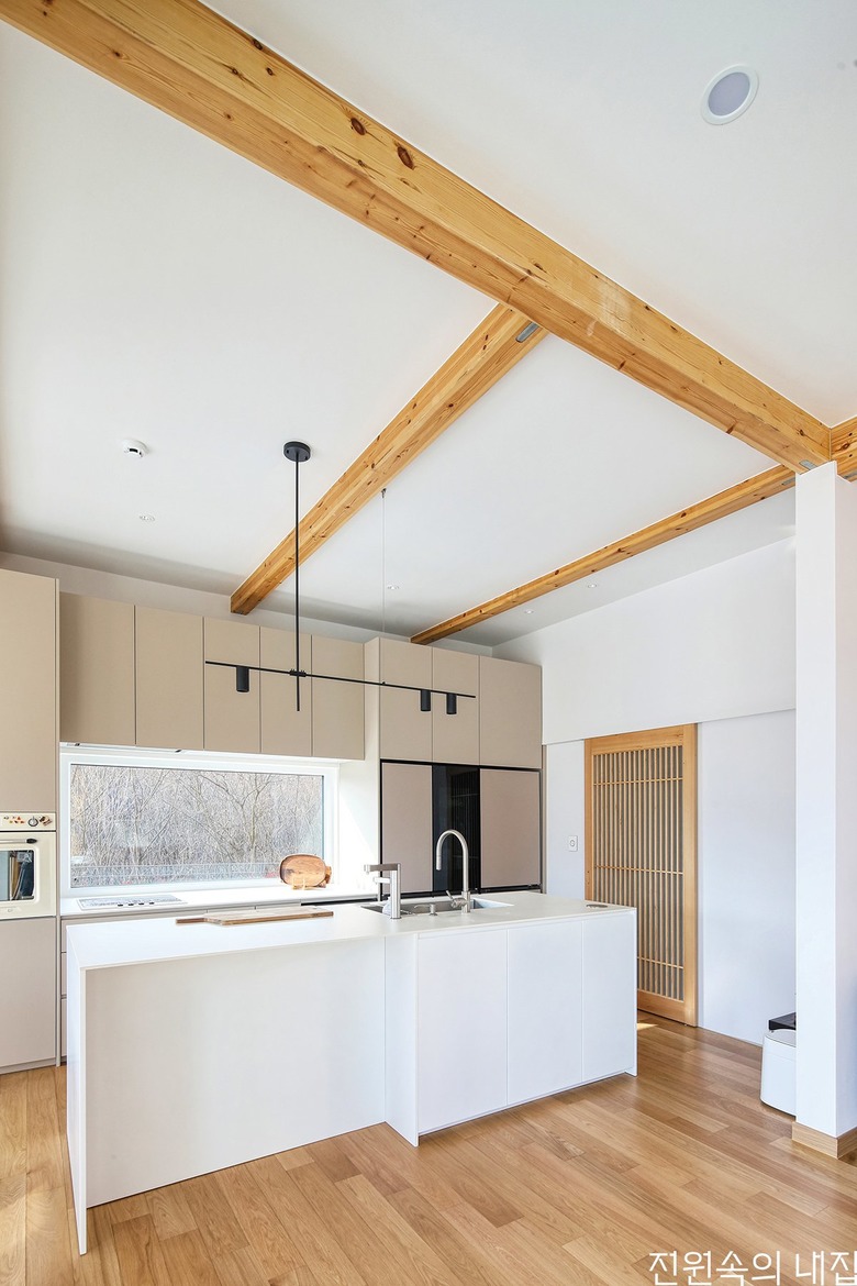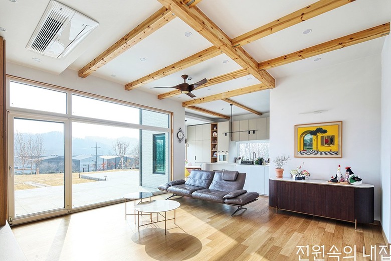 천장에 나무 보가 노출되어 목조주택이 주는 자연스러운 감성이 스민 거실. 한켠으로 주방과 다이닝룸이 이어진다. |