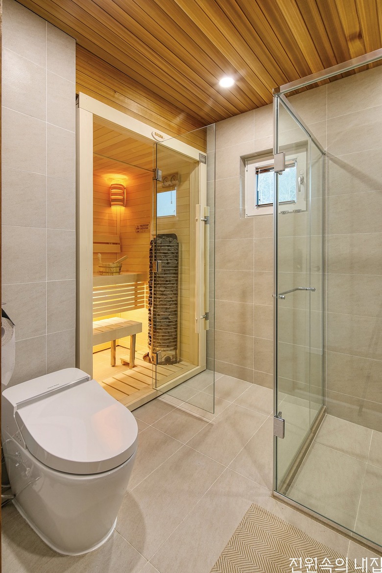 핀란드식 건식 사우나가 설치된 1층 욕실 내부. |