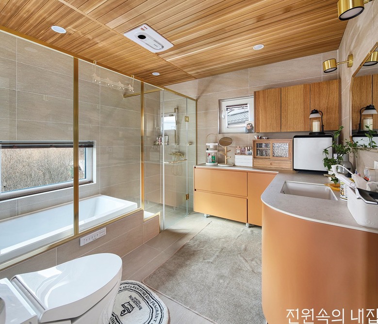 목재와 차분한 베이지톤으로 디자인한 욕실. 단순한 욕실의 기능을 넘어 몸과 마음을 재충전하기 위한 최적의 공간이 되고 있다. |