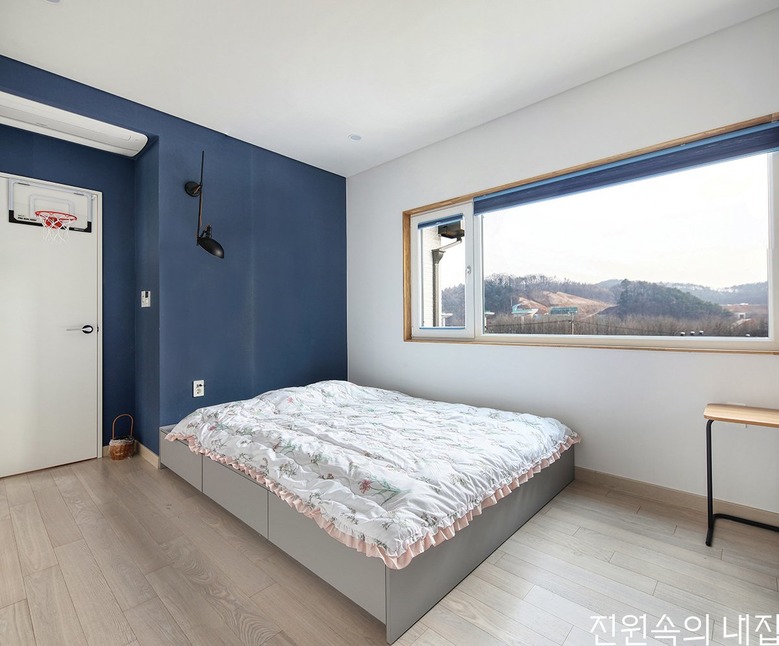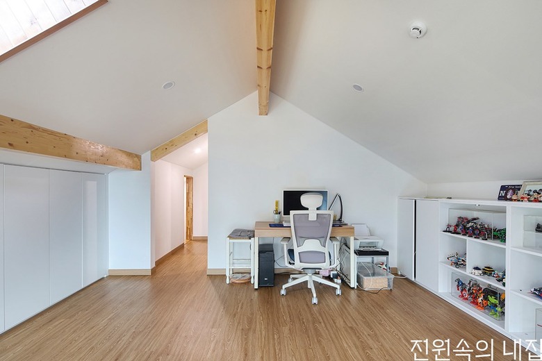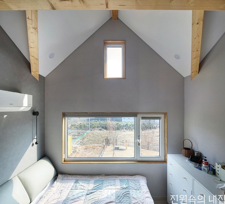 중목구조의 골조가 다이나믹하게 드러나는 자녀방. |