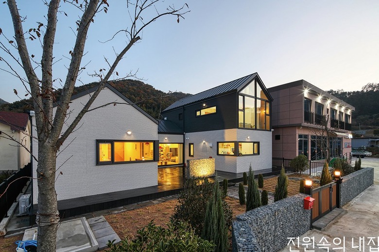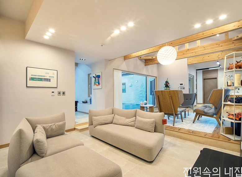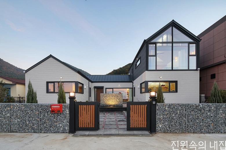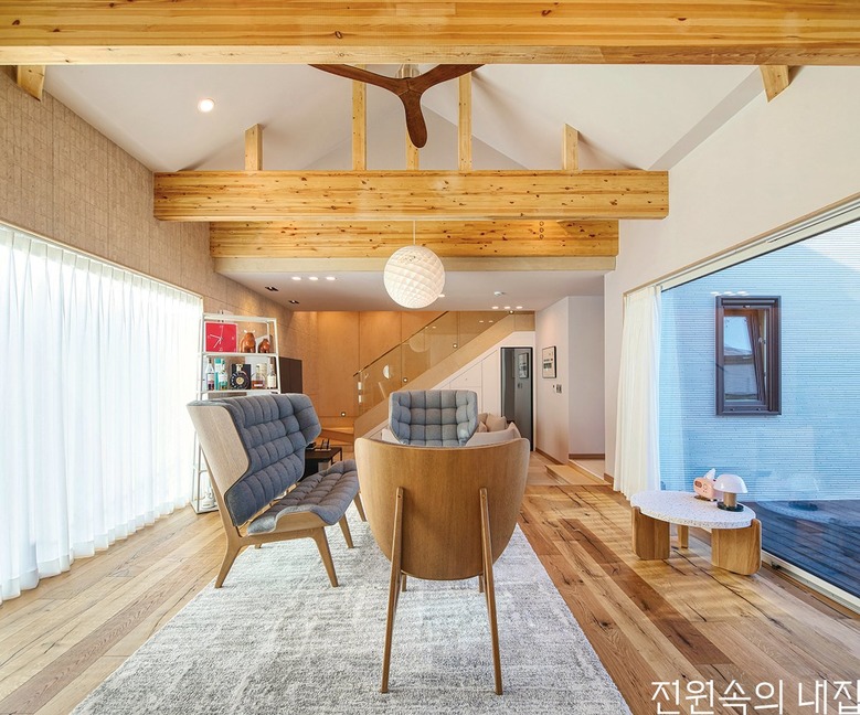 단층의 한옥 구조를 선호하는 건축주를 위해 현대적인 인테리어와 세라믹 사이딩 외장재로 모던하게 재해석된 중목구조 주택이 탄생했다. 우선 내부는 노모와 함께 하는 생활을 고려해 1층에 모든 동선을 집중시켰다. 거실과 세탁실, 욕실이 한 복도에 이어지는 구성이다. 욕실은 노모의 생활 편의를 위해 좌식 세면대와 밑으로 판 다운 욕조를 디자인했다. 또 모임이 많다는 점을 고려해 1층에 두 개의 거실을 디자인했다. 하나는 전창을 통해 앞뒤로 바다와 뒷산을 감상할 수 있고, 나머지 하나는 TV를 보며 담소를 나눌 수 있어 넉넉하게 손님을 수용할 수 있게 됐다.