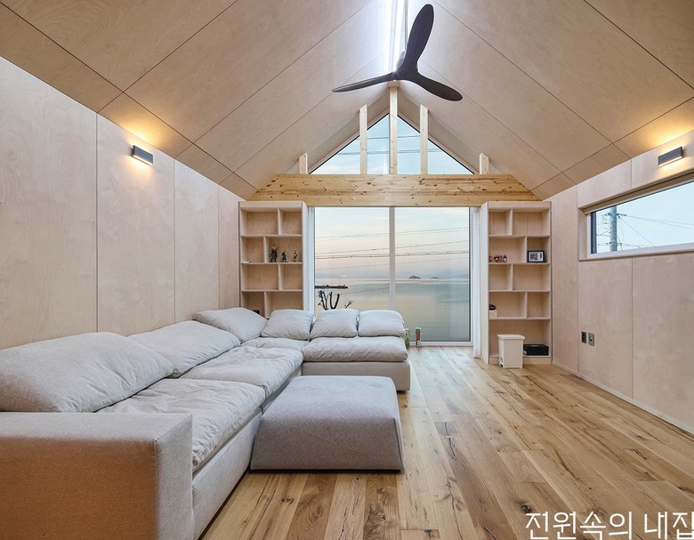 2층 가족실은 지붕선을 따르는 천장과 바다를 향해 난 통창으로 개방감을 극대화시켰다. |