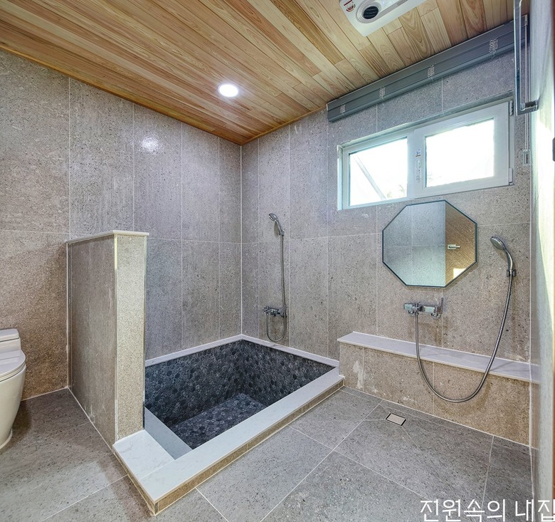 ![]() 1층 욕실에는 나무를 천장재로 적용하고 다운 욕조를 사용해 작은 온천탕에 온 기분을 느낄 수 있다. |