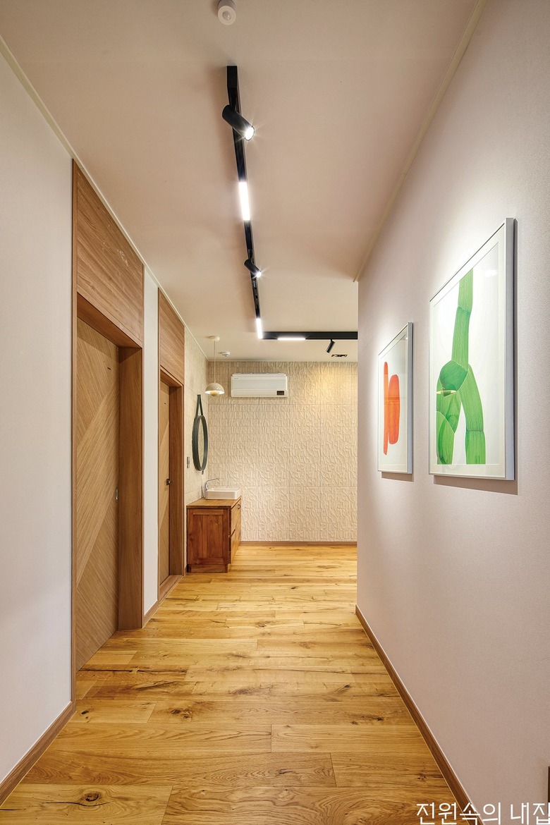 안방으로 향하는 복도에 욕실과 다용도실을 두어 1층의 생활 공간이 동선상으로 자연스럽게 분리된다. |