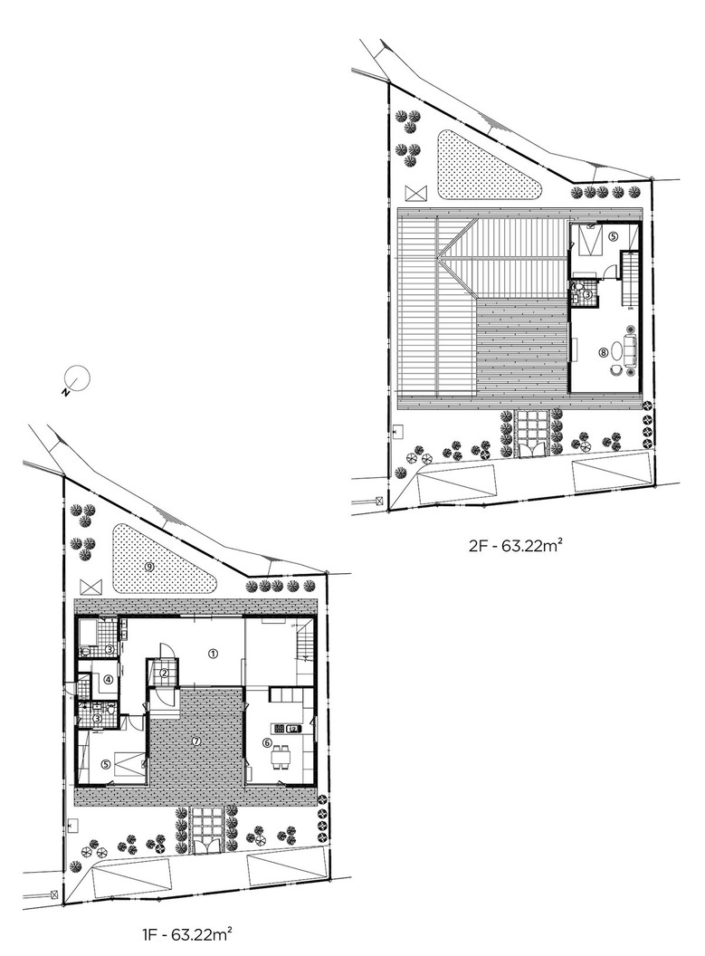 ① 거실 ② 현관 ③ 욕실 ④ 세탁실 ⑤ 침실 ⑥ 주방 ⑦ 데크 ⑧ 가족실 ⑨ 뒷마당 |