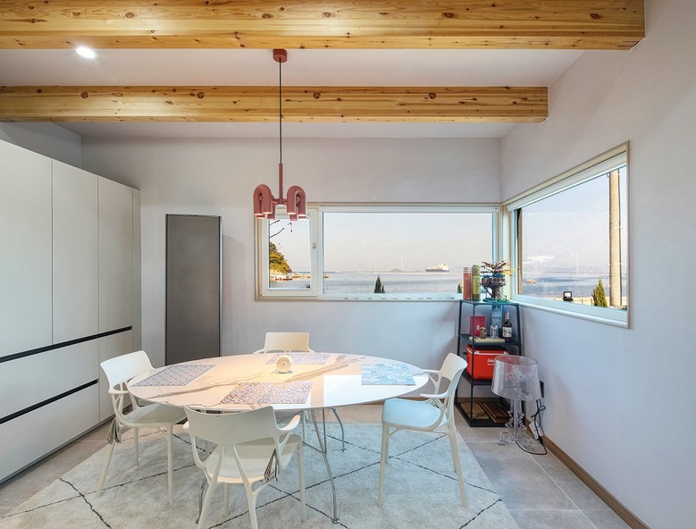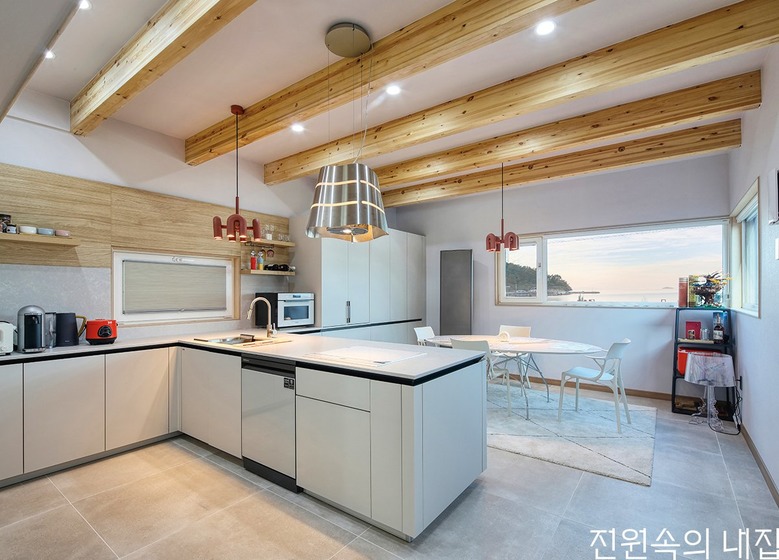 거실 위로는 중목구조의 특성인 박공지붕 밑 장선이 노출되어 특유의 감성을 더한다. 이어지는 주방 또한 ㄷ자의 한쪽 끝을 다 차지할 정도로 크고 단순한 동선으로 계획해 편의를 높였다. 주방에서 반대편 끝에 위치한 침실에는 머리맡 바로 위로 와이드한 코너창을 내어 시선 끝에 바로 바다가 걸리도록 했다.