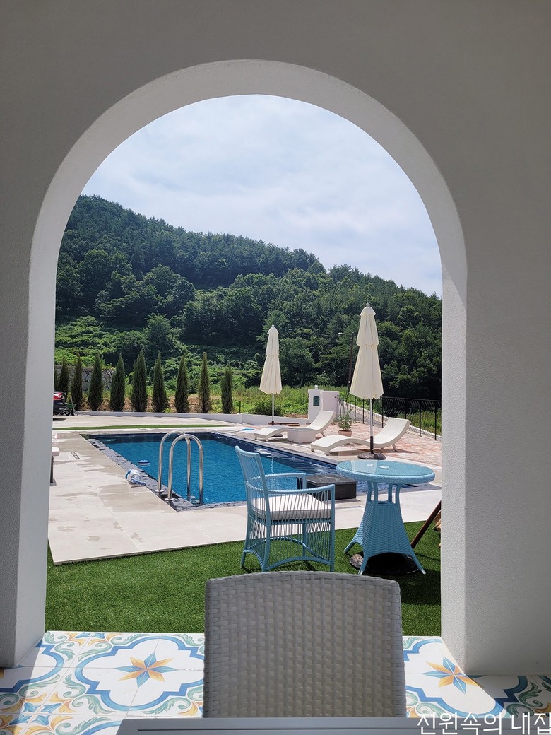 ![]() 아늑한 아치형 회랑 공간에서 바라본 수영장이 있는 마당 풍경. |