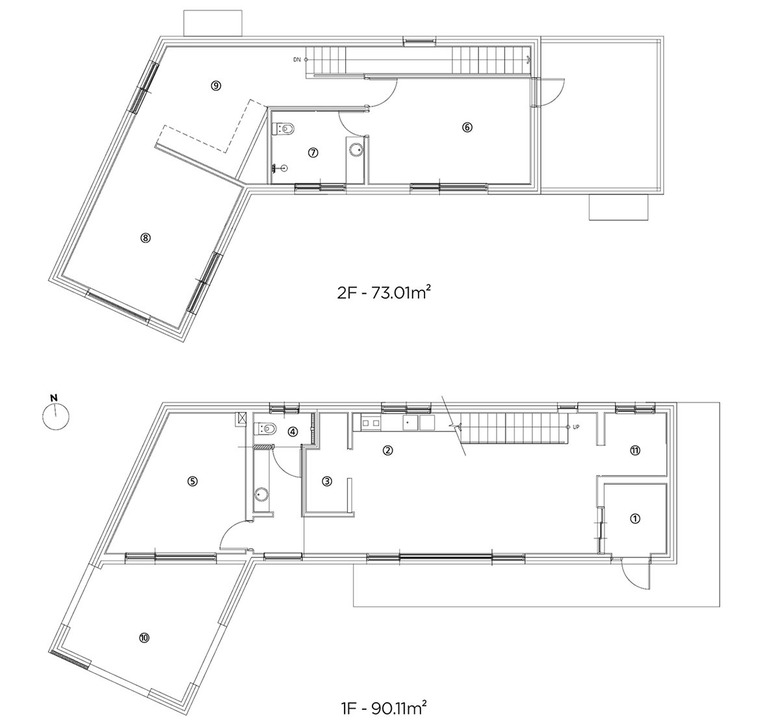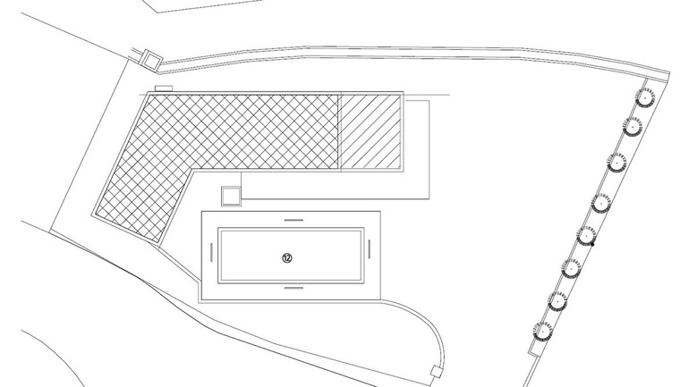 ![]() ① 현관 ② 주방/식당 ③ 팬트리 ④ 화장실 ⑤ 게스트룸 ⑥ 침실 ⑦ 욕실 ⑧ 서재 ⑨ 공동거실 ⑩ 회랑 ⑪ 창고 ⑫ 수영장 |
