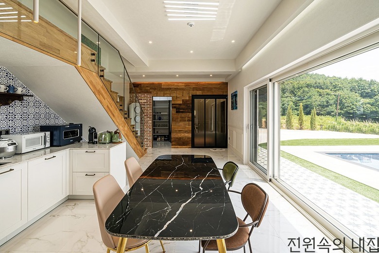 지중해풍 양식은 집 안 곳곳에서도 묻어난다. 특히 1층 바닥에 시공된 대리석 타일을 비롯해 욕실, 현관, 회랑, 테라스, 수영장 등 공간 곳곳에 시공된 스페인 타일 덕분에 이국적인 분위기가 한층 돋보인다. 이 외에도 수입 고재, 무절 편백 원목, 고벽돌 등 자연적인 물성의 재료가 심리적인 편안함을 더해준다.