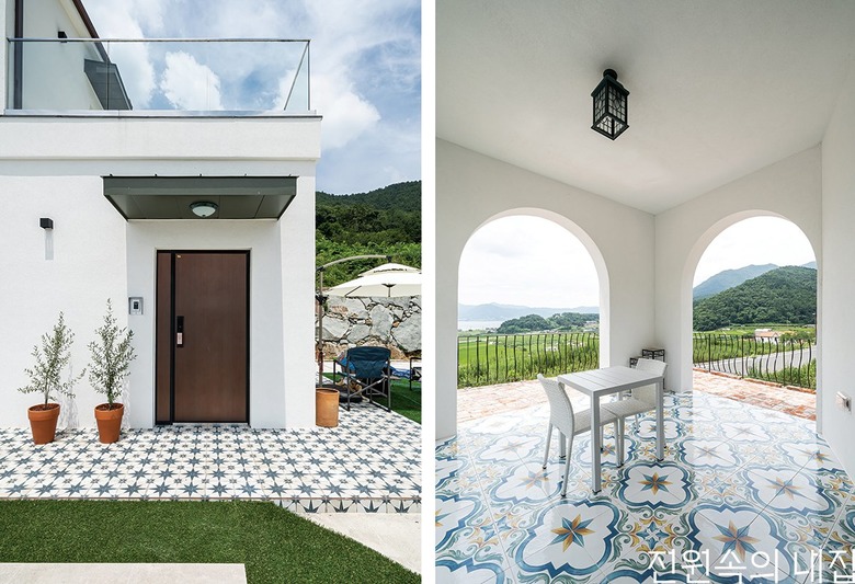 ![]() 군더더기 없이 필요한 요소로만 꾸며진 현관. 심플한 디자인의 처마가 사랑스럽다. / 게스트룸과 이어지는 회랑에는 화려한 패턴의 타일 바닥을 시공해 마치 스페인 마을에 있는 듯한 착각을 불러일으킨다. |