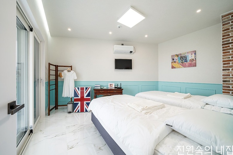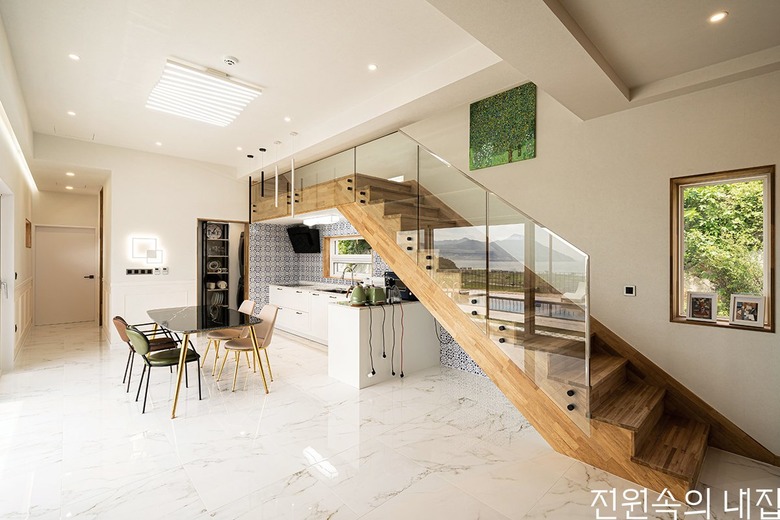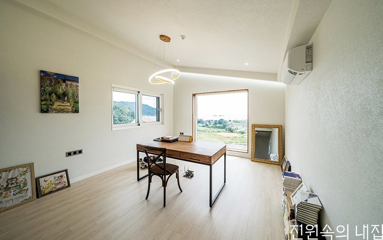 밝은 대리석 타일로 화사하고 이국적으로 연출된 1층과는 달리, 2층은 마룻바닥에 원목이 주를 이루는 차분하고 심플한 공간으로 꾸며졌다. 작가의 집인 만큼 전망이 가장 뛰어난 곳에 서재를 배치했다. 주택을 부채꼴 필지에 맞춰 설계하며 가장 전망이 좋은 2층 전면에 서재를 둔 것이다. 너른 창을 통해 실내로 한가득 들어오는 창밖의 풍경, 감탄할 만한 뷰다. 앵강만과 마을이 고스란히 내려다보인다. 그렇게 푸르른 바깥 풍경을 배경으로 두고, 내부는 화이트 회벽으로 마감했다. 부드러운 화이트 컬러와 원목이 주를 이루는 공간. 편안한 색감으로 이뤄진 가구와 그림들이 머무는 내내 편안함을 준다.