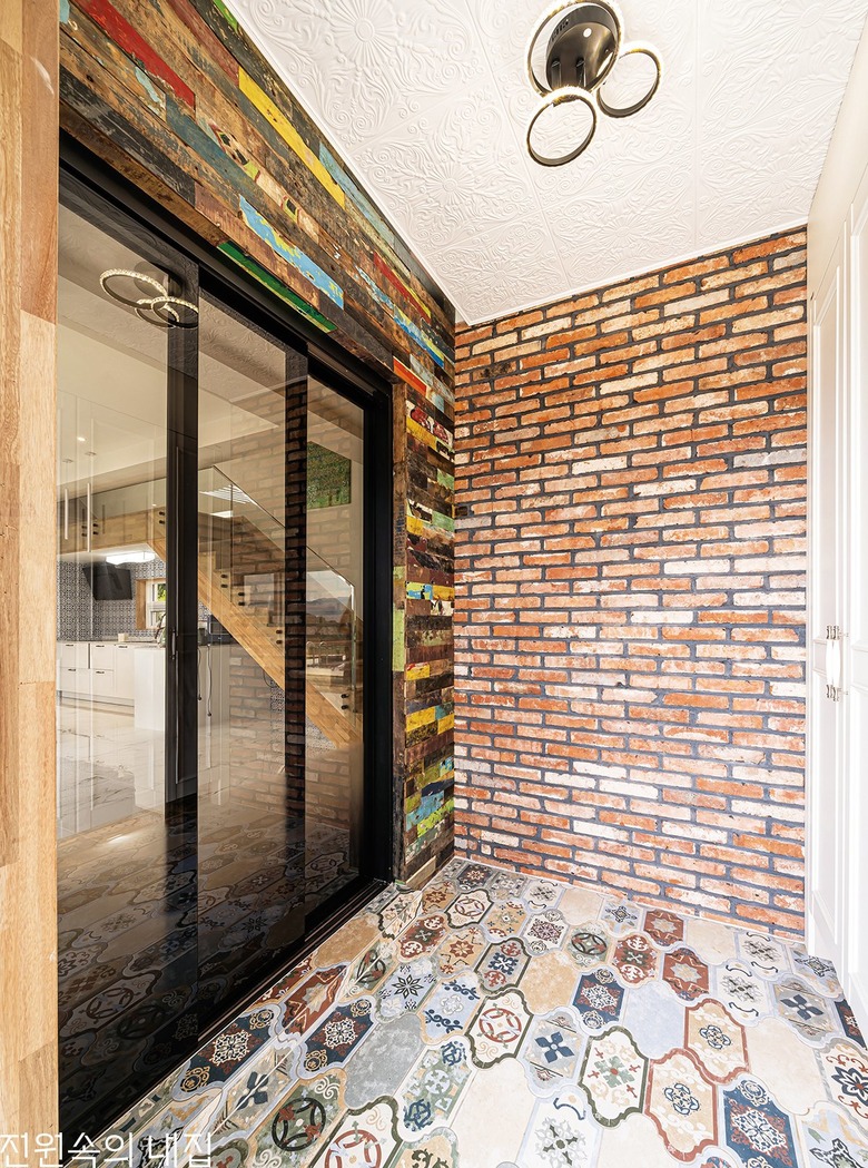 ![]() 화려한 문양의 타일과 고벽돌, 고재 등으로 꾸며진 현관. |