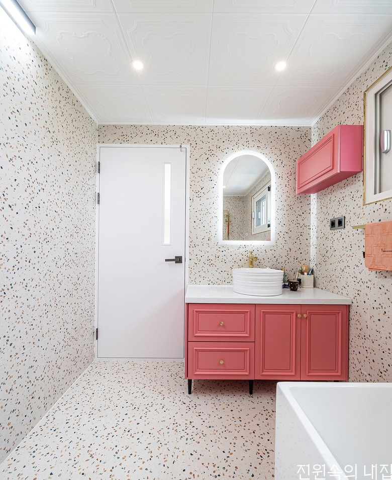 ![]() 테라조 타일과 분홍색 욕실장이 감각적인 개인 욕실. |