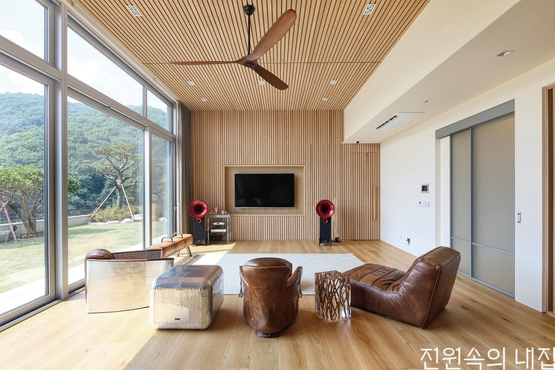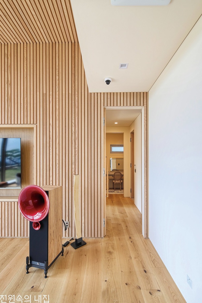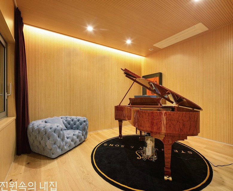 피아노를 전공한 건축주의 연주 공간. 콘서트홀을 연상시키는 원목 마감재는 음향 효과를 내기에도 탁월하다. |