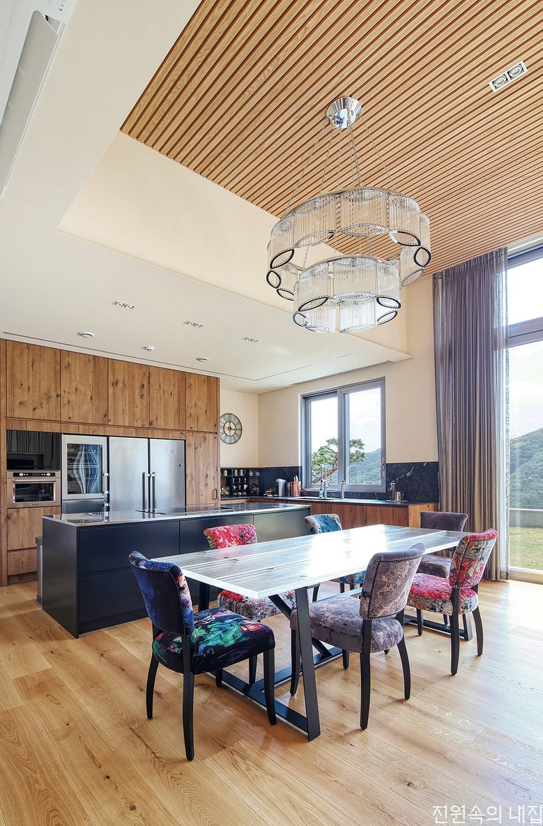 아일랜드 조리대로 깔끔하게 꾸민 주방. 원목 수납장과 스틸 가전제품의 조화가 돋보인다. |