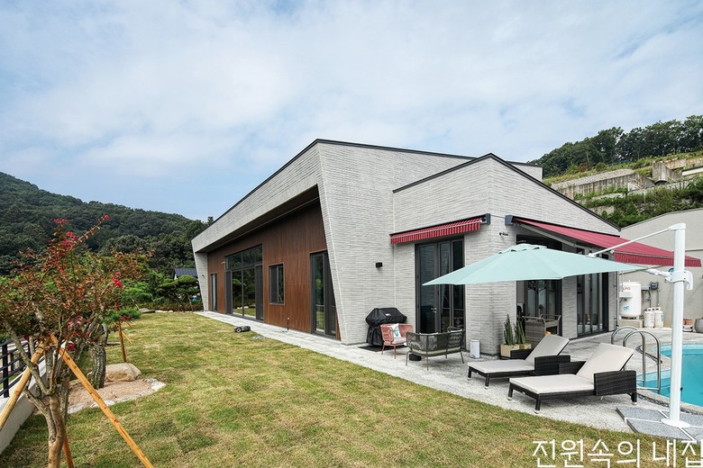거실 쪽 외부에 조성된 마당 조경 공간. 보는 각도에 따라 건물의 모양이 달라보인다. |