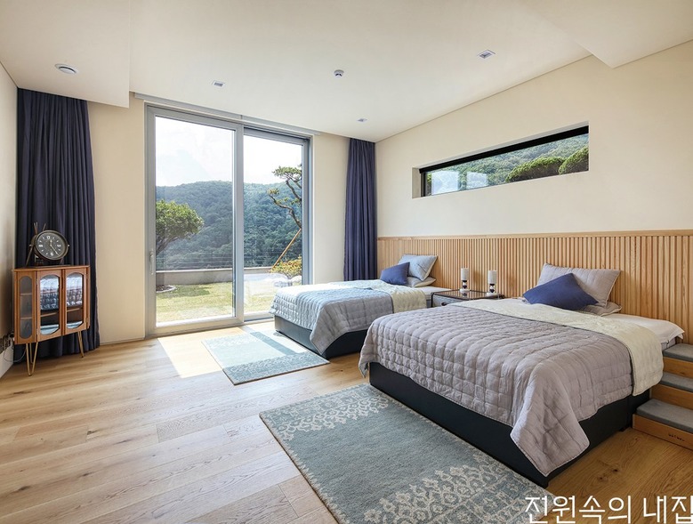 마당 너머 산 전망이 내다보이는 침실. 긴 가로창으로 개방감을 한층 더했다. |