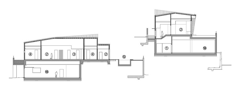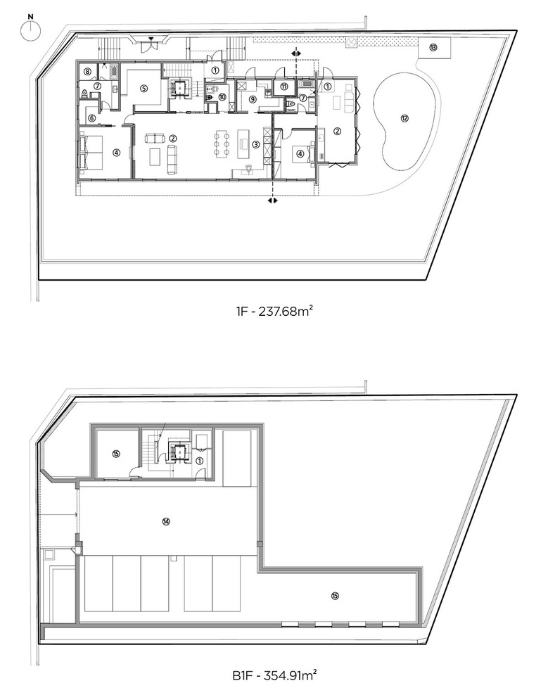 ① 현관 ② 거실 ③ 주방 ④ 침실 ⑤ 드레스룸 ⑥ 파우더룸 ⑦ 욕실 ⑧ 사우나실 ⑨ 다용도실 ⑩ 반려견 욕실 ⑪ 보일러실 ⑫ 수영장 ⑬ 수영장 기계실 ⑭ 주차장 ⑮ 창고 |
