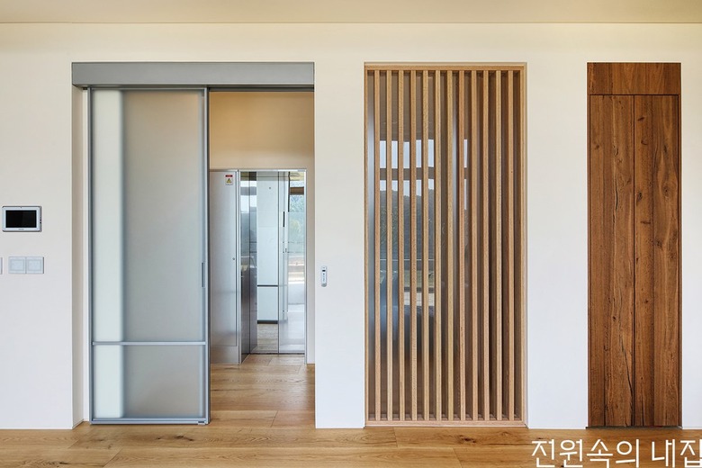 지하로 향하는 엘리베이터와 계단실. 같은 높이의 간살창과 수납장이 정돈된 느낌을 준다. |