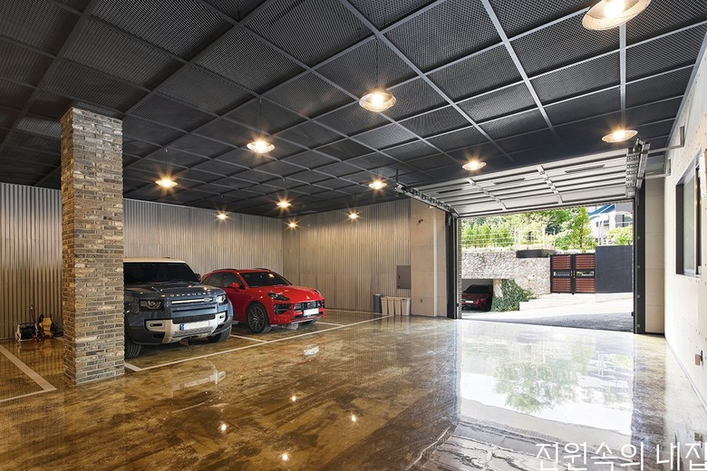 지하는 계단과 엘리베이터를 이용해 내려갈 수 있는데, 계단을 따라 내려가면 코너에 피아노실이 있다. 벽면과 바닥을 원목으로 마감하고 한쪽 면은 지하주차장이 보이는 큰 창을 설치했다. 지하주차장은 이 집의 또 다른 포인트. 차를 좋아하는 건축주는 오롯이 자동차만을 위한 공간을 제대로 만들고 싶었다. 마당 높이에 따라 자연스럽게 지하층의 높은 층고가 확보됐고, 다양한 마감재를 활용한 인더스트리얼 인테리어로 미국의 낡은 창고같은 느낌을 연출했다.
