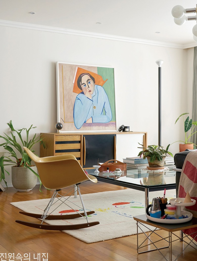 빈티지 가구와 오래된 아파트가 어우러진 공간에 식물과 그림이 생기를 더한다. |