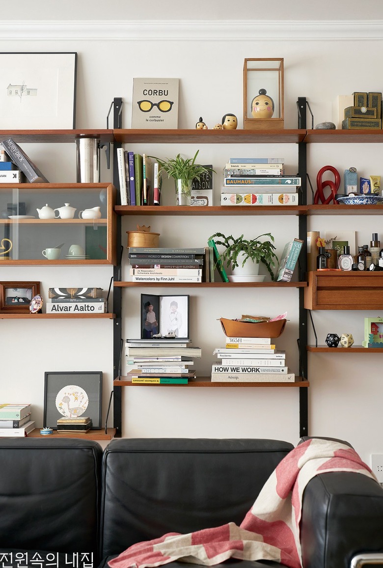 거실 한쪽 월시스템 영감이 되어줄 책, 취향 가득한 오브제들이 가득하다. |
