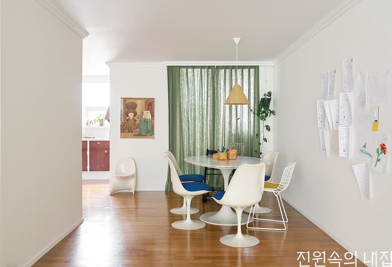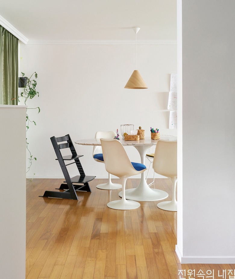 내추럴 분위기의 다이닝 공간. 맞은편 벽에는 대학 시절 그린 그림을 걸고, 오른쪽 벽에는 아이의 그림을 모아 무심한 듯 붙여두었다. |