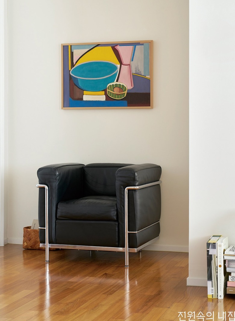 집의 완성에 결정적 계기가 되어준 고경애 작가의 그림. 맞은편 소파에 앉아 턱을 괴고 있는 그 모습을 보고 있자면 나도 모르게 마음이 평온해진다고. |