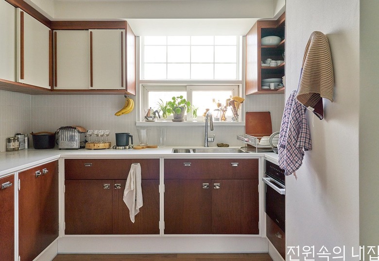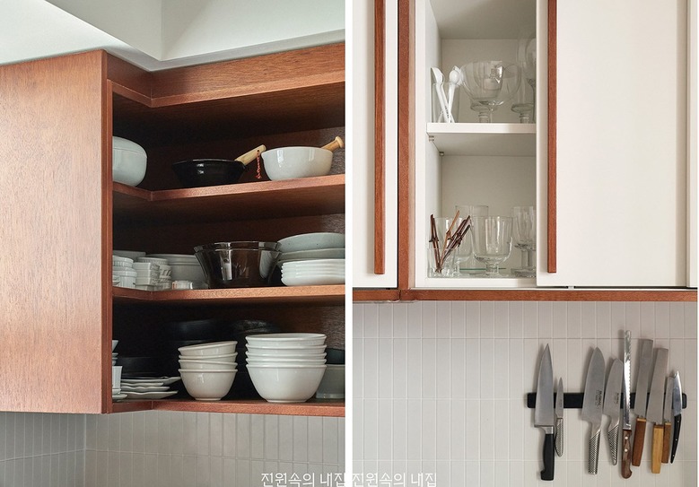 (위, 아래) 주방 싱크대 앞 창문은 원래 있던 것이다. 주방 가구에는 취향 담긴 살림살이가 가지런히 정리되어 있다. |