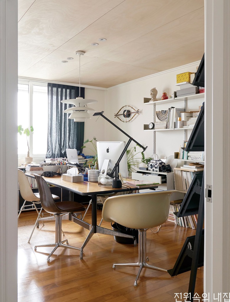 현관 옆 남편의 서재. 조명이 어둡다는 요청에 얼마 전 매입등을 시공하면서 천장을 비치합판으로 새로 마감했다. |