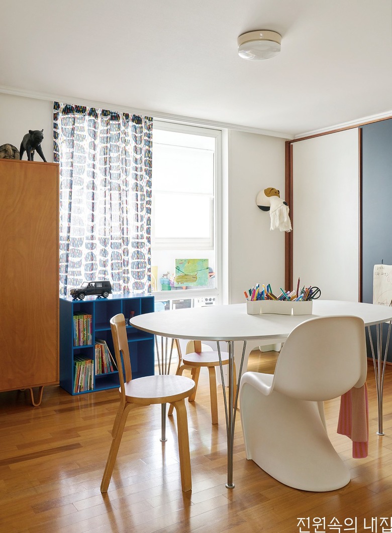 다양한 빈티지가구가 자연스럽게 자리하는 아이방. 놀잇감과 책이 가득하다. |