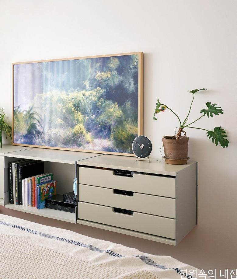침대 맞은편에는 최소한의 수납가구, 액자 같은 디자인의 TV만 두었다. |
