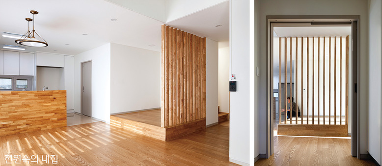 현관 앞에 위치한 다목적이자 무목적인 1평 알파룸. 루버로 적당히 시선을 가리고 단차를 둬 공간의 위계를 달리했다. |