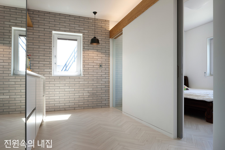 복도 끝 벽돌로 마감한 벽면 아래 작은 책상 하나만 두면 완성되는 나만의 소거실 |