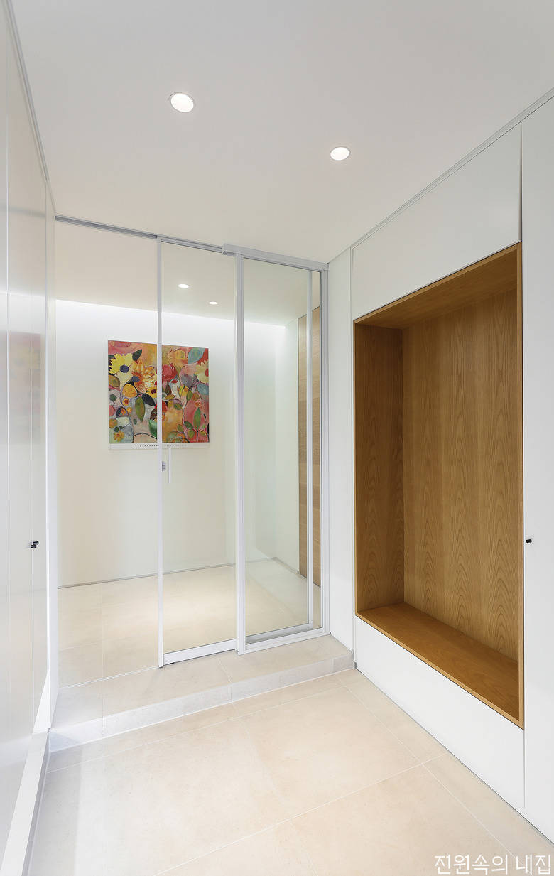 외부 마당과 연결된 2층 현관. 벽면에는 앉거나 짐을 놓을 수 있는 벤치를 마련했다. |