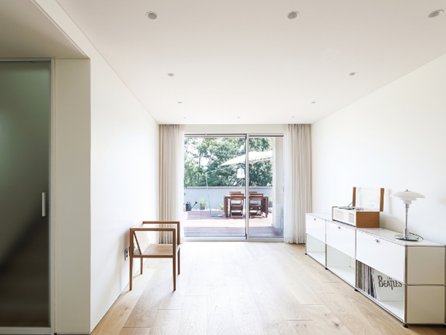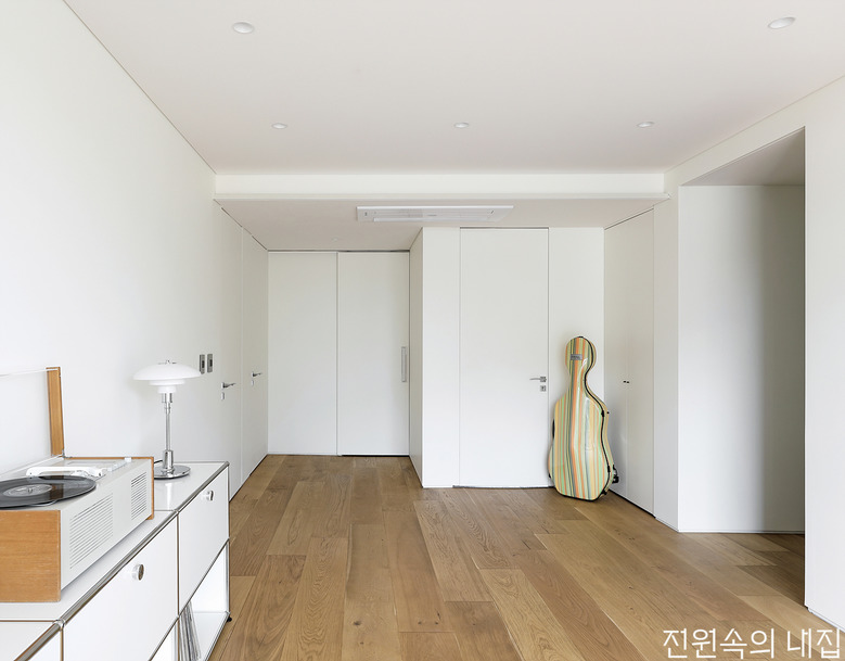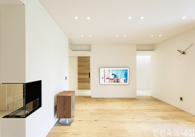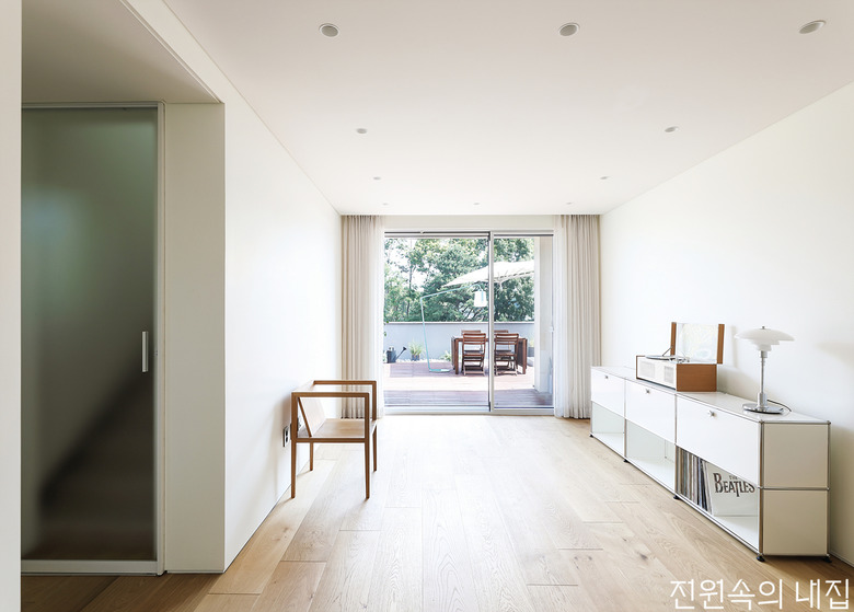 미니멀하게 꾸민 3층 거실의 모습. 문틀과 경첩이 드러나지 않는 도어를 천장 상부까지 올려 층고가 높아 보인다. |