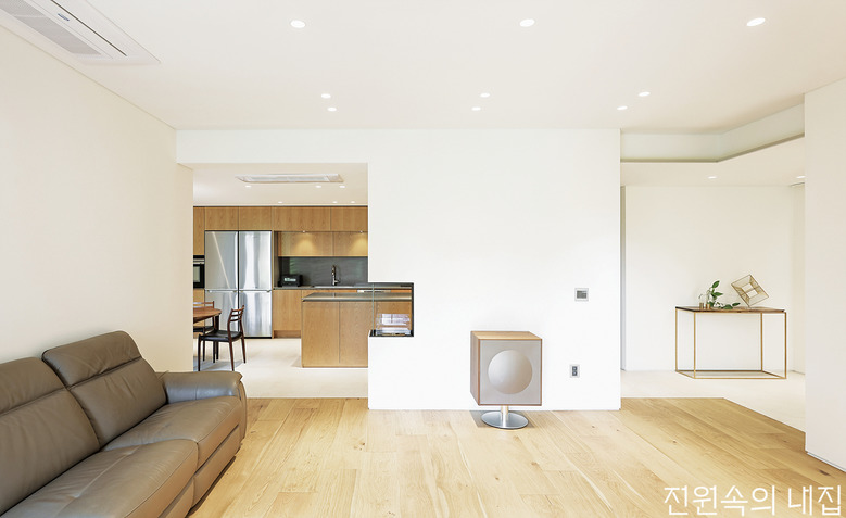 오랜 준비 끝에 맞이한 부부의 힐링 하우스. 하얗게 펼쳐진 공간에 따뜻한 목재가 온기를 불어넣는다.
