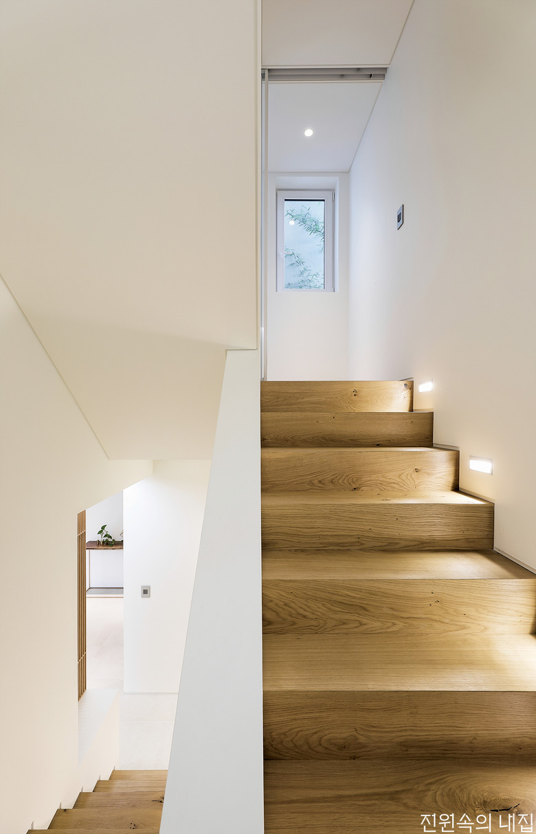 3층으로 이뤄진 주택은 경사진 곳에 지어져 낮은 대지의 1층 현관과, 마당과 연결된 2층 현관으로 출입이 가능하다. 부부가 자주 이용하는 1층 현관은 창고와 계단만을 품은 공간으로, 우아한 조명과 모던한 컬러 조합으로 고급스러운 분위기를 더했다. 1층 계단을 올라 2층에 도착하면 가장 먼저 새하얀 복도와 마주한다. 정면으로는 깔끔하게 정제된 거실과 주방 공간이 펼쳐지는데, 전체적으로 화이트와 우드 인테리어를 차용했고, 특별한 소품 없이 필요한 가구로만 채워 미니멀한 인테리어를 구현했다.