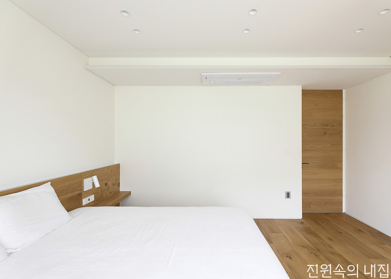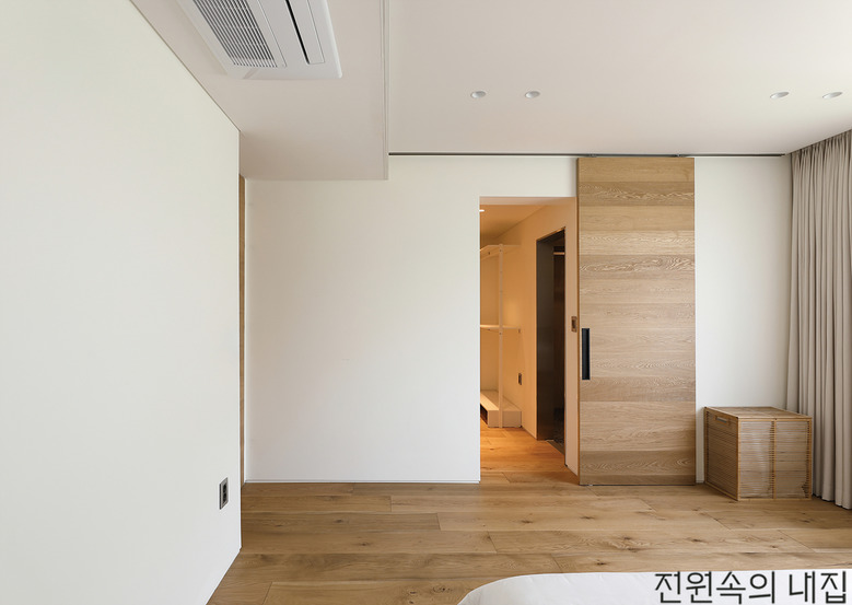 2층 복도 끝으로는 부부의 욕실과 드레스룸을 품은 침실 그리고 2층 현관이 자리한다. 부부 침실과 드레스룸은 목재 슬라이딩 도어로 공간을 나누었다. 드레스룸의 넉넉한 수납공간 덕분에 침실에는 수납장 없이 침대 가구로만 채워 넓은 공간을 확보할 수 있었다.