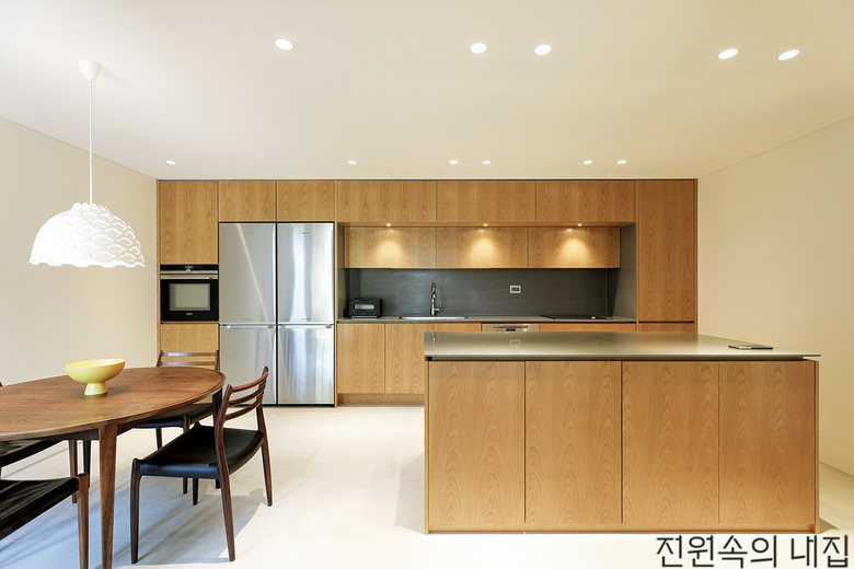 우드 소재의 가구로 채운 주방과 다이닝 공간. 아일랜드를 추가로 배치해 효율적인 작업 공간을 확보했다. |
