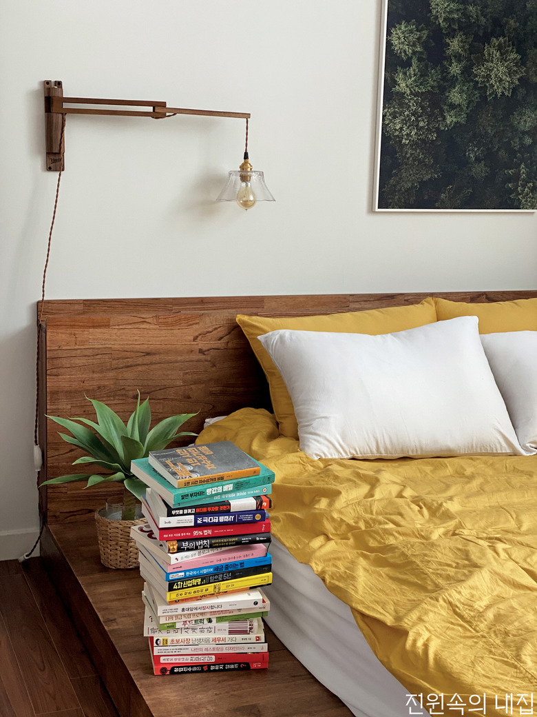 디테일이 숨어있는 침실 공간. 침대 프레임에 여유 공간을 두어 책 등을 놓을 수 있도록 했다. #침실인테리어 #침대프레임 |