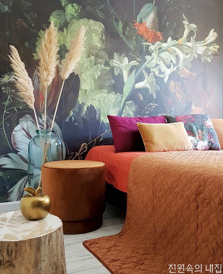 꽃무늬 벽지가 그 자체로 플랜테리어 역할을 하는 부부 침실. 화려함을 더한 대신 나머지 가구·소품은 간소하게 배치했다. |