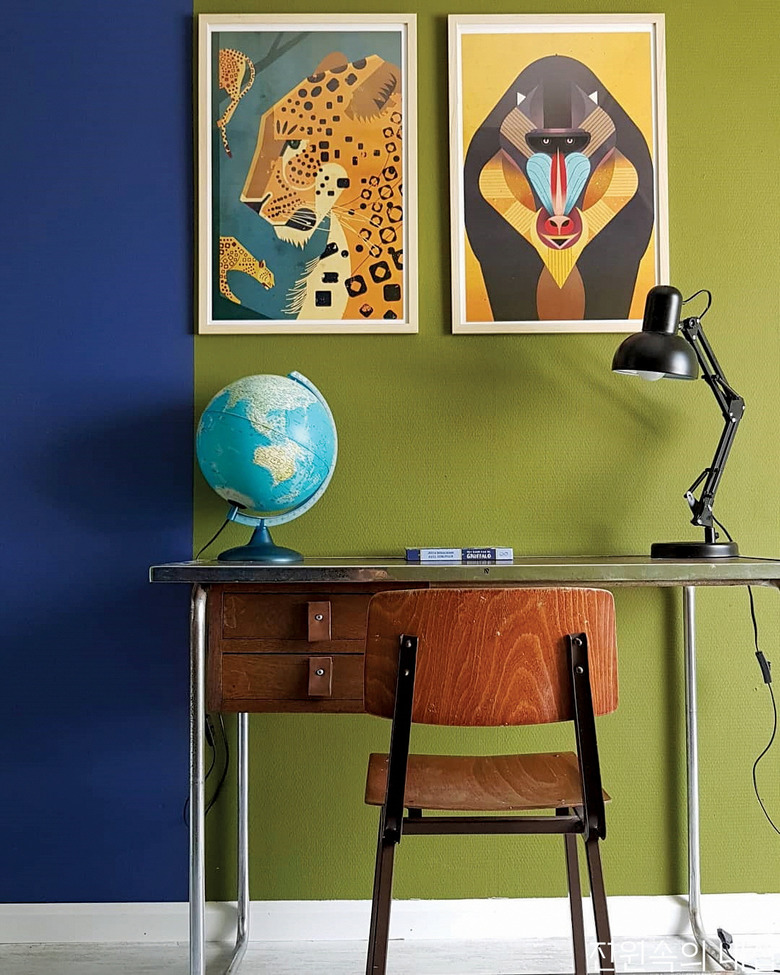 아이방은 집중력을 높일 수 있도록 블루와 그린 컬러의 벽지를 사용했고, 컬러풀한 동물 포스터 액자로 벽면을 채웠다. #childrensroom #posterdesign |