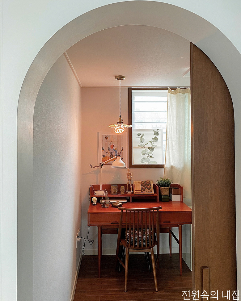 남은 공간을 활용한 남편의 개인 서재. 아치형 입구와 목재 슬라이딩 도어로 포인트를 주었다. |