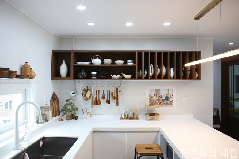 흰 색상의 벽면과 주방 가구로 깔끔하게 구성한 주방. 여기에 목재 선반과 주방용품으로 인테리어 효과를 더했다. #주방인테리어 #우드선반 #아치문 |