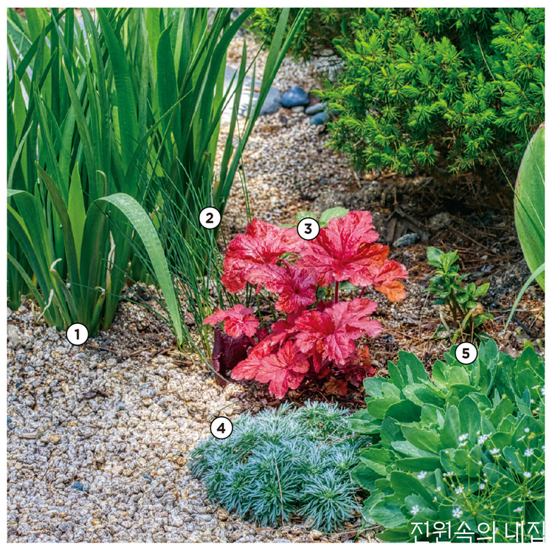 앞에서부터 뒤로 갈수록 키가 높아지는 식재는 자칫 지루하고 경직되어 보인다. 식물이 다 자랐을 때의 사이즈를 잘 파악해 균형 있게 변화를 주자. 알리움 드럼스틱은 붓꽃처럼 상승형의 잎사귀이지만 훨씬 가늘고 둥근 형태로, 휴케라와 함께 심으면 상충작용을 한다.