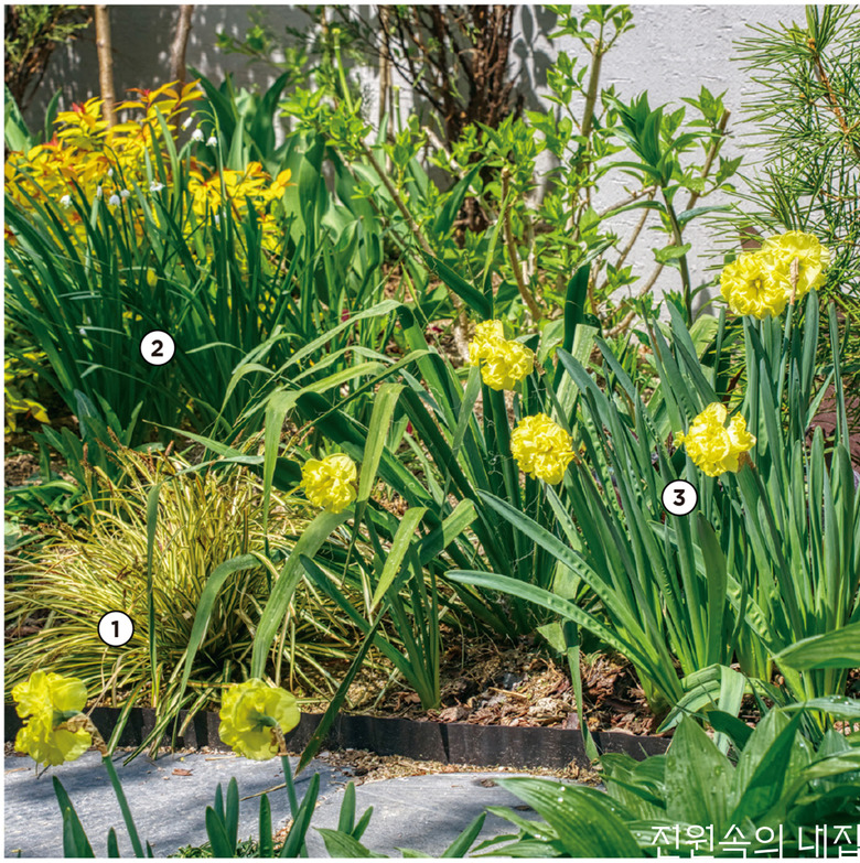 ③겹수선화(Double Daffodil ‘Atholl Palace’) 다른 종류의 겹수선화 Tazetta Daffodil ‘Erlicheer’보다 키가 크며 조금 더 노란빛을 띤다. 에버골드 사초와 색상, 형태가 아주 잘 어울린다.